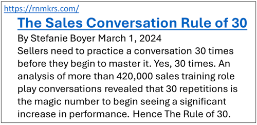 Every sales leader would agree, it is important that salespeople practice their sales techniques with co-workers so that they do not practice on their prospects. Improving skills, practicing the game plan, and getting feedback from the practice sessions are crucial for success. Sales leaders, just get started and don’t get caught up in making it perfect. Practice is never perfect.