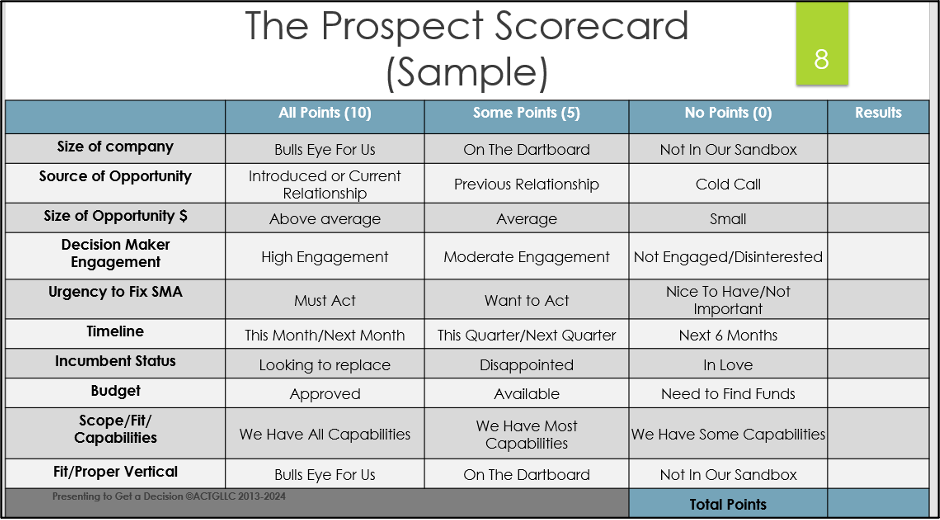 As this scorecard indicates, a salesperson actually starts preparing for their presentation as they are qualifying the prospect. Effective sales proposals start at the very beginning of the process.